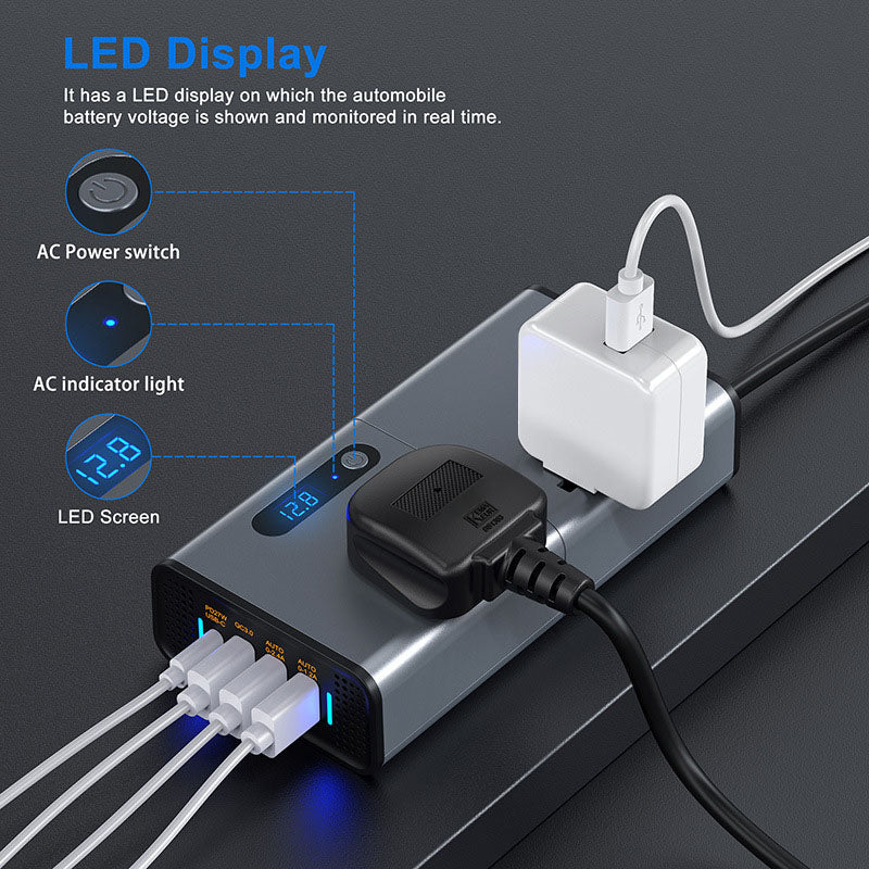 Transform your driving experience with our car power inverter, delivering a continuous DC to AC power supply. Featuring dual 230V AC outlets and 4 USB ports, the 4 USB ports allow simultaneous charging of your phones and tablets. Ideal for powering string lights, laptops, game consoles, Kindles, DVDs, iPads, and more.